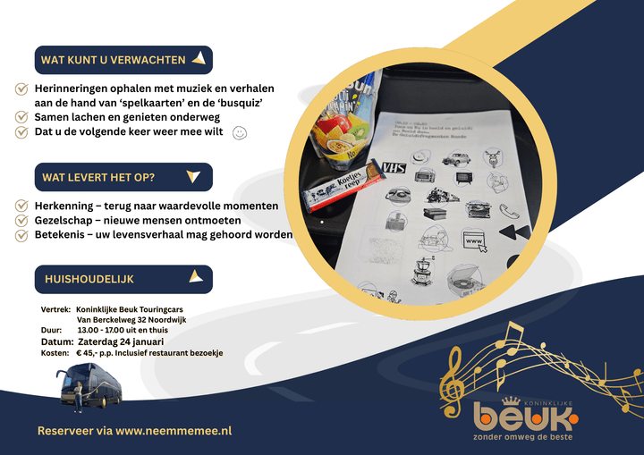 Het blije schoolreisje van vroeger waar muziek, herinneringen en herkenning samenkomen. Een paar uurtjes zorgen loslaten.