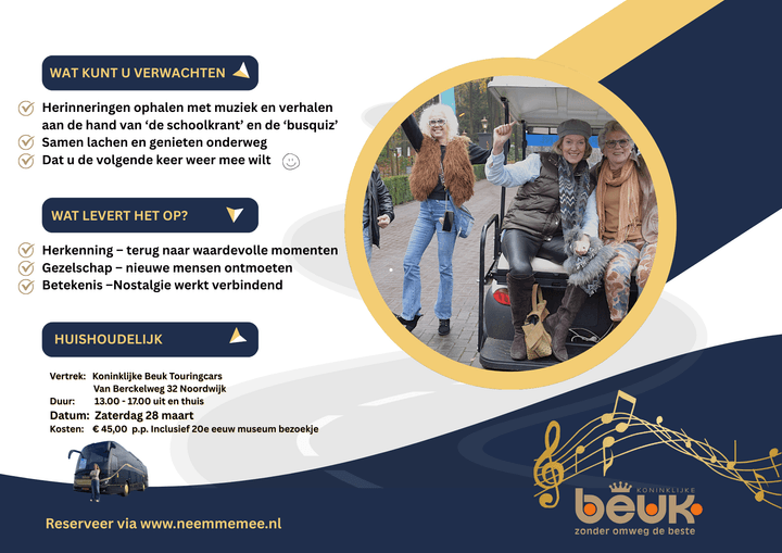 Het blije schoolreisje van vroeger waar muziek, herinneringen en herkenning samenkomen. Een paar uurtjes zorgen loslaten.